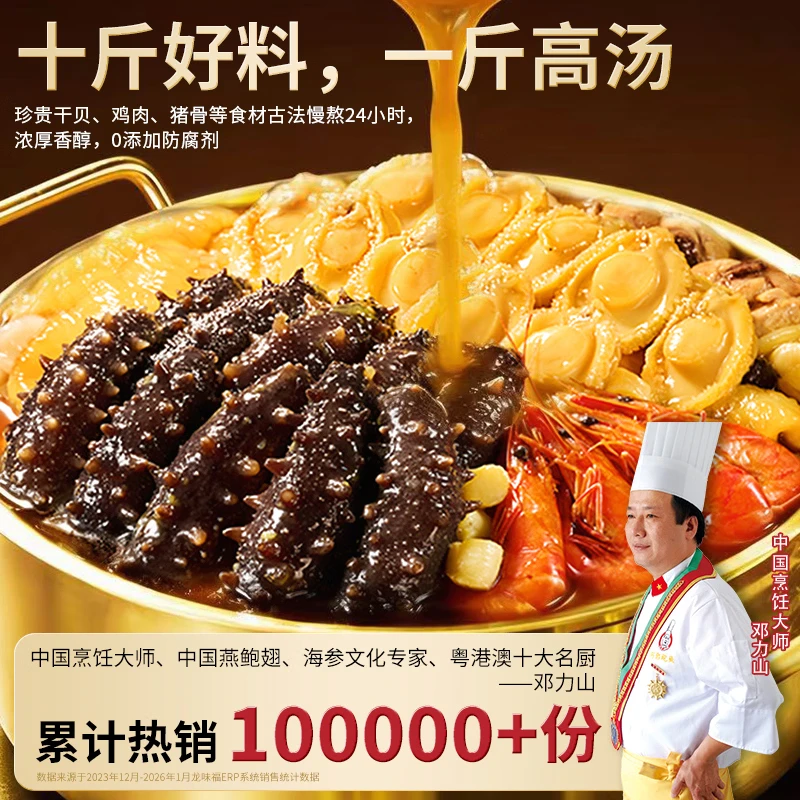 龙味福佛跳墙是今年年货节的热销单品,内含8枚精选海参和8只鲜美鲍鱼,重量高达1200g。这款预制菜采用传统工艺精心制作,富含高蛋白、低脂肪等营养成分。